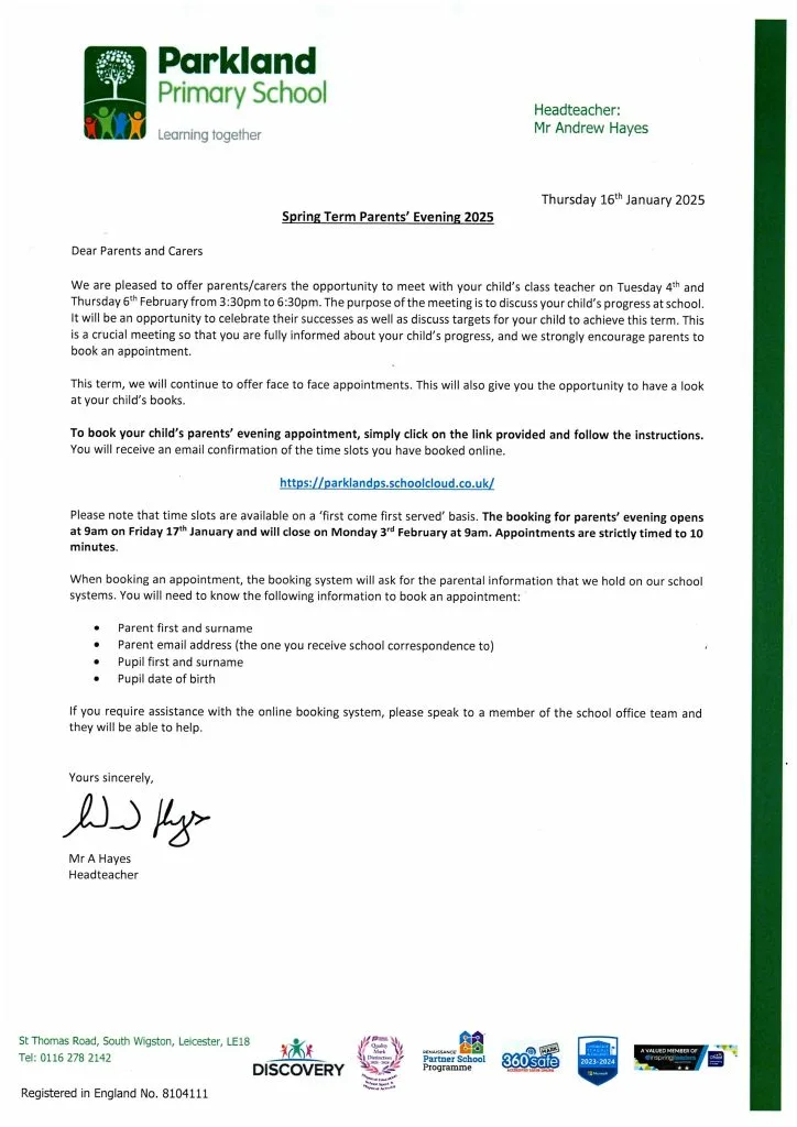 We are pleased to offer parents/carers the opportunity to meet with your child’s class teacher on Tuesday 4th and Thursday 6th February from 3:30pm to 6:30pm. To book your child’s parents’ evening appointment, simply click on the link on the letter that has been emailed.