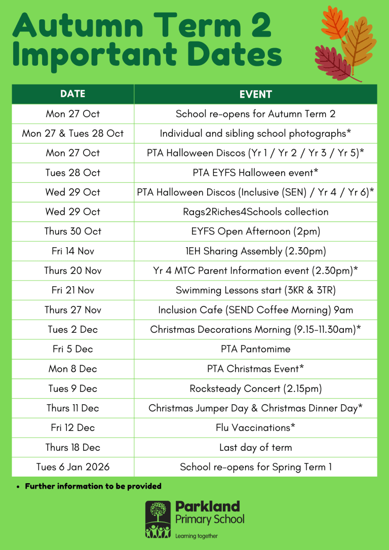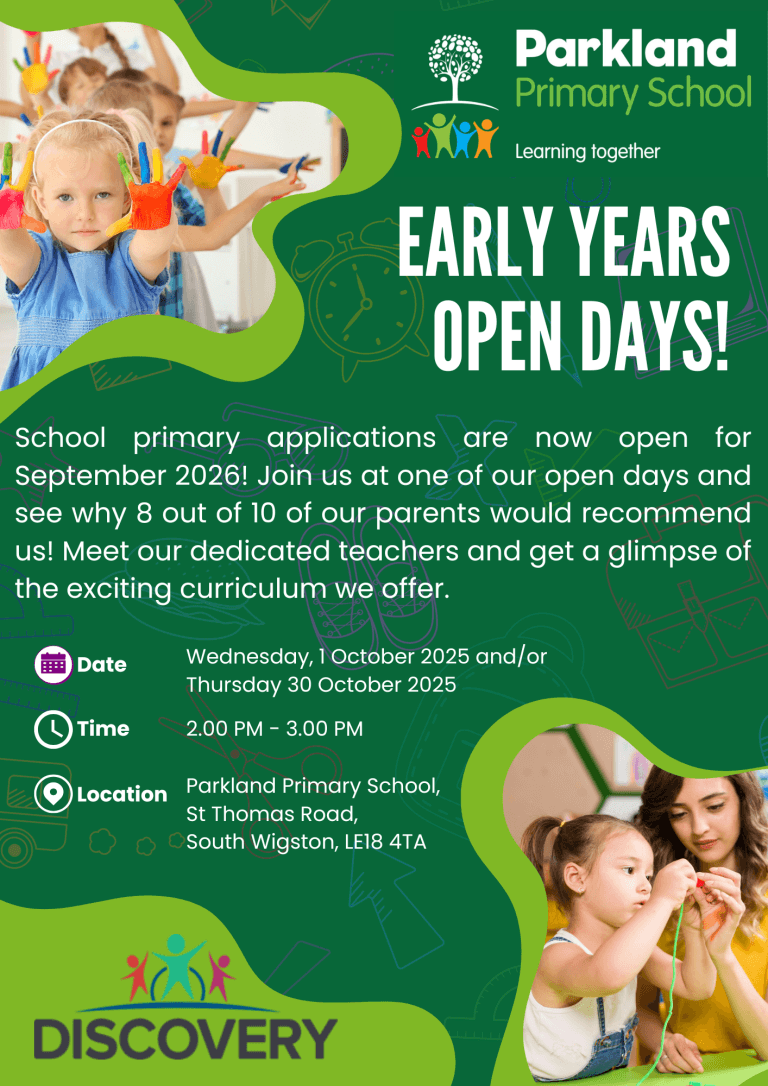 Is your child due to start primary school in September 2026? Join us at Parkland Primary School’s Early Years Open Days on the 1st and/or 30th October. We look forward to welcoming you!
